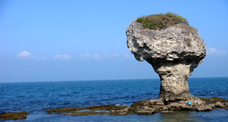觀音石位於厚石一帶,因外貌酷似面海觀音沉思佇立的模樣而得名。 與花瓶石、紅番石併列為小琉球三大地標。